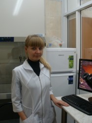- Инженер лаборатории биоинженерии тканей А.В. Мелешина на рабочем месте